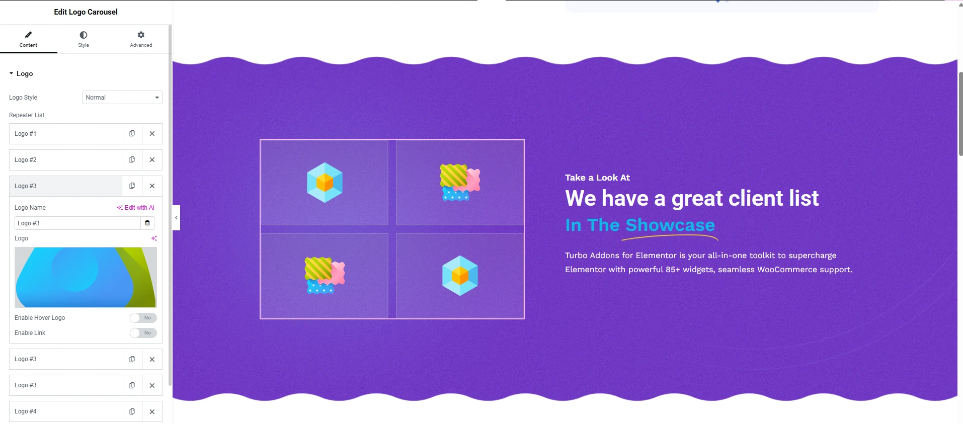 The Logo Carousel Elementor Free widget allows you to display multiple brand or partner logos in a responsive carousel layout. You can easily control logo content, carousel behavior, and visual styling without writing any code.