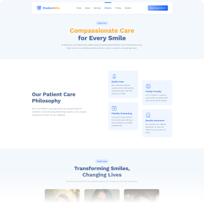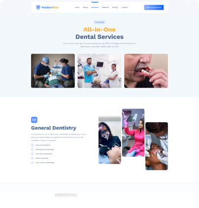 Create a professional dental clinic website in minutes. This Dental Care template is designed for dentists, dental clinics, orthodontists, and oral care professionals who want a clean, modern, and conversion-focused website.