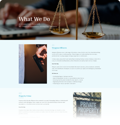 Practice Areas – Detailed overview of all legal services offered.
